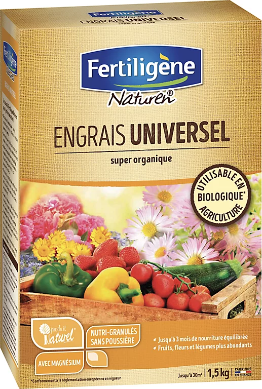 Idéal pour toutes les variétés de fruits, légumes, fleurs, arbres et arbustes cultivées en pleine terre ou en pots, l’engrais universel Fertiligene Naturen 1,5kg apporte jusqu’à 3 mois de nourriture très complète grâce a sa composition organique enrichie en calcium et algues marines…
